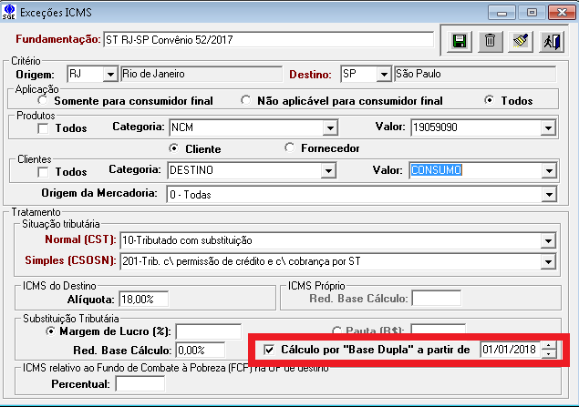 No cadastro de Exceções agora é possível informar se o cálculo é feito pela base dupla (onde o próprio valor do ICMS ST faz parte de sua base) e a partir de quando esse tipo de cálculo passa a valer.