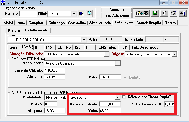 Nas telas que possuem a aba de tributação (pedidos de venda, orçamentos, notas fiscais, etc) também foi incluído o flag de indicação de cálculo por "Base Dupla" que é alimentado pelos dados da exceções cadastradas mas poderá ser alterado manualmente