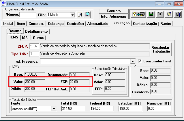 Nesse caso no site da receita e no xml o ICMS exibido será de apenas R$ 180,00 enquanto no Corporator exibirá o acumulado dos R$ 180,00 + R$ 20,00 do FCP como era feito até a 3.10, essa manutenção visa não confundir o usuário somente pelo fato do layout enviado a receita ter mudado