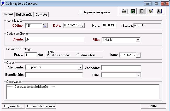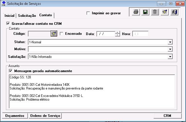 Ao gravar a solicitação com a opção “Gravar/alterar contato no CRM” marcado o sistema irá gerar automaticamente os dados no CRM como se os mesmo tivessem sido digitados na tela de “Relacionamento com Clientes”.