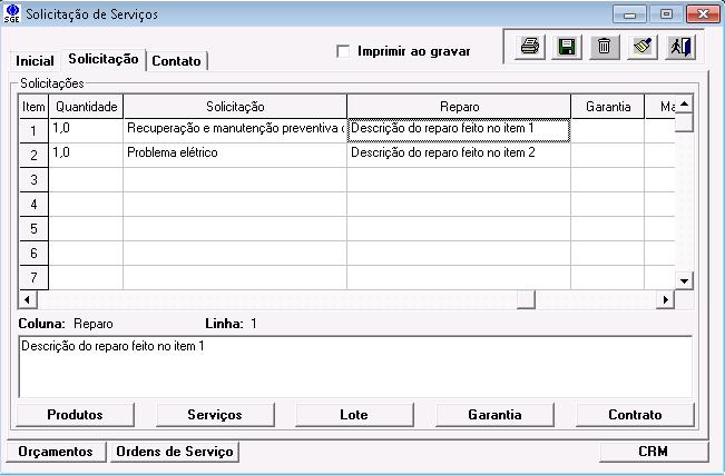 A exibição dos itens foi alterada para incluir o campo “Reparo” e esse e o campo “Solicitação” poderão ser editados abaixo do grid de forma a facilitar a visualização de textos longos