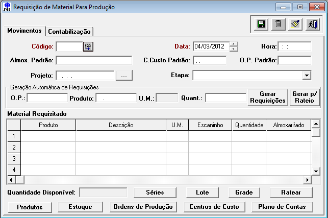 Foram incluídos dois botões com o propósito de facilitar a requisição em caso de compartilhamento de matéria-prima entre vários itens a serem produzidos onde existe variações de consumo entre produções, por exemplo nas confecções onde, dependendo do corte, uma determinada quantidade de tecido é utilizado para fabricação de N tipos de peças diferentes e para cada tipo de risco existe um % de aproveitamento maior ou menor do tecido.