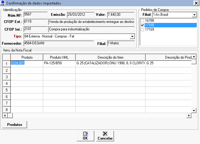 ii) Uma tela de confirmação de dados se abrirá. Lá o sistema mostrará os dados que vieram do XML e indicará sua correlação dentro do sistema. Informações como o código do produto, unidade de medida, tipo de nota fiscal e o CFOP interno deverão ser conferidos e caso estejam em branco ou errados deverão ser informados. A cada importação o sistema guardará os dados usados e os considerará na próxima utilização dessa funcionalidade