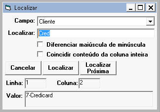 Para facilitar a posição da linha, coluna e valor do campo que foi localizado é exibida também.