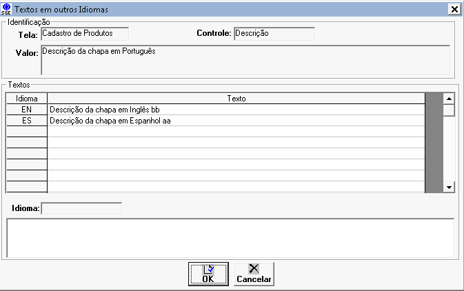 Ao posicionar o cursor do mouse no campo de descrição e apertar F10 uma tela de cadastro dos valores para outros idiomas se abrirá, é só preencher os valores e salvar o produto em seguida para gravar as informações.