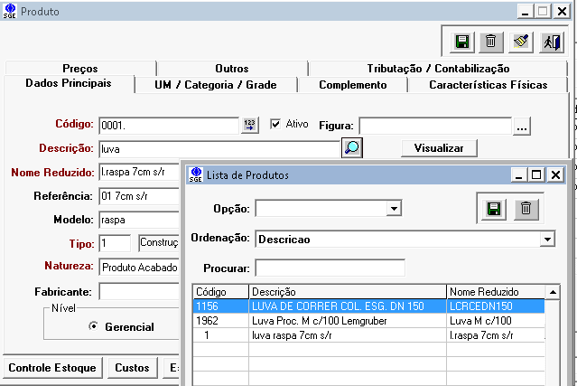 Digitando parte da descrição e clicando em F2 (tecla de atalho) ou no botão ao lado da descrição, automaticamente será aberto uma consulta com todos produtos cadastrados que contém o texto digitado na descrição