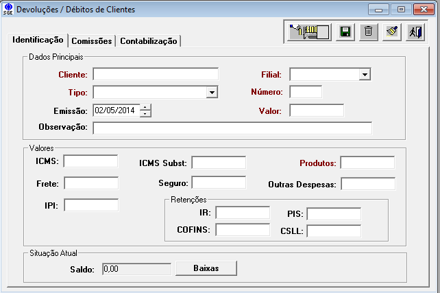 Foi incluído o campo "Saldo" e o botão “Baixas” nas telas de Débitos com Clientes, Créditos com Fornecedores e Adiantamentos com Fornecedores para exibir o saldo atual e todas parcelas que usaram o saldo para serem baixadas conforme figura abaixo.