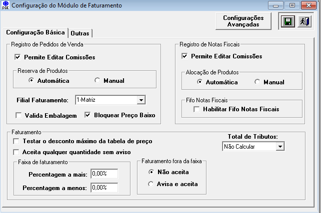 Para melhorar a flexibilidade na configuração do sistema foi incluído o botão “Configurações Avançadas” na tela de Configurações no módulo de faturamento.
