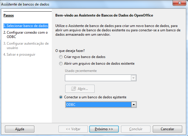 3- Selecione "Conectar a um banco de dados existente" e selecione "ODBC", em seguida clique no botão "Próximo"