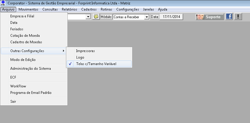 O primeiro passo é confirmar se a opção de "Telas c/Tamanho variável" está habilitada em "Arquivo\Outras Configurações", caso não é necessário habilitá-la, sair do Corporator e entrar novamente.
