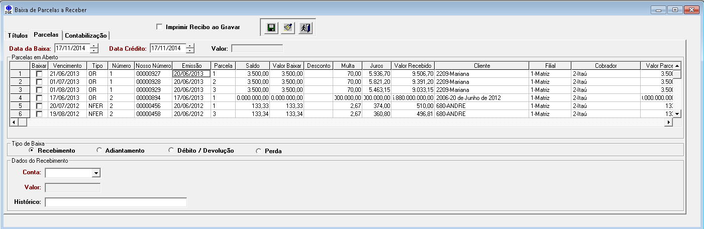 Usando a tela "Contas a Receber: Movimentos\Baixa Manual\Por seleção" como exemplo