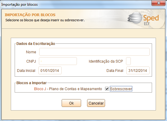 5.3 - Selecione o arquivo gerado pelo Corporator e informe que é para sobrescrever o bloco J (bloco com o plano de contas, centros de custo e mapeamento do plano de contas referencial)