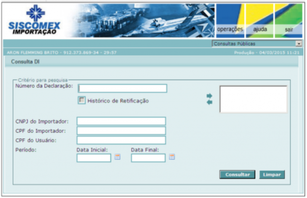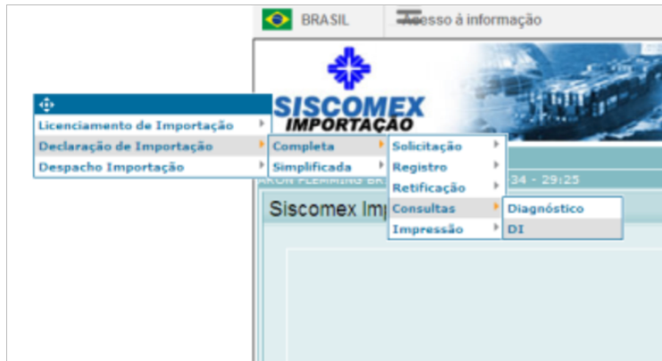 2-Após entrar usando o seu certificado digital acesse "Operações\Declaração de Importação\Completa\Consultas\DI"