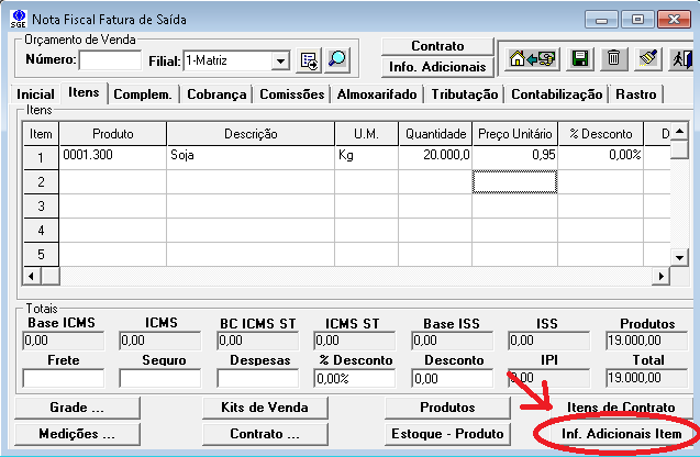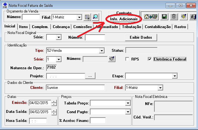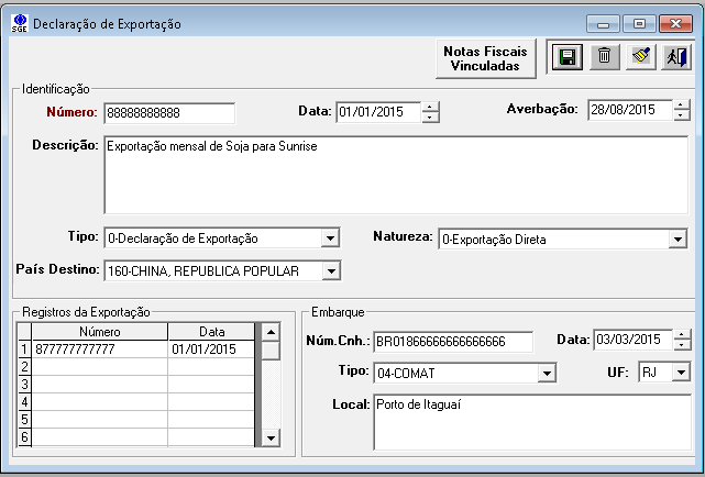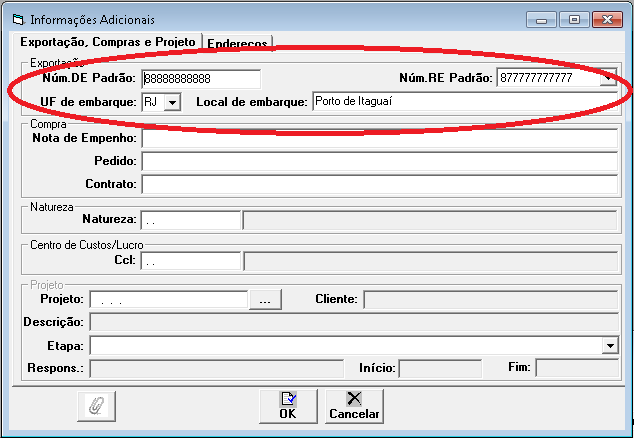 Ao lançar uma nota fiscal de exportação é necessário clicar no botão "Info. Adicionais" e preencher as informações do número da declaração e número do registro (se existir)
