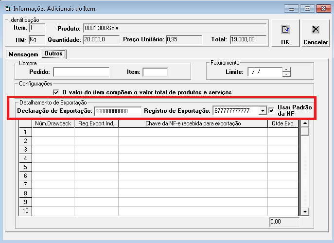 Caso, uma mesma nota fiscal, possua itens de diferentes declarações ou registro é necessário clicar no item do grid de itens e abrir as informações adicionais dele, nesse caso é possível desmarcar a opção "Usar Padrão da NF" no "Detalhamento de Exportação" e com isso habilitar a alteração do número da declaração e registro do item.